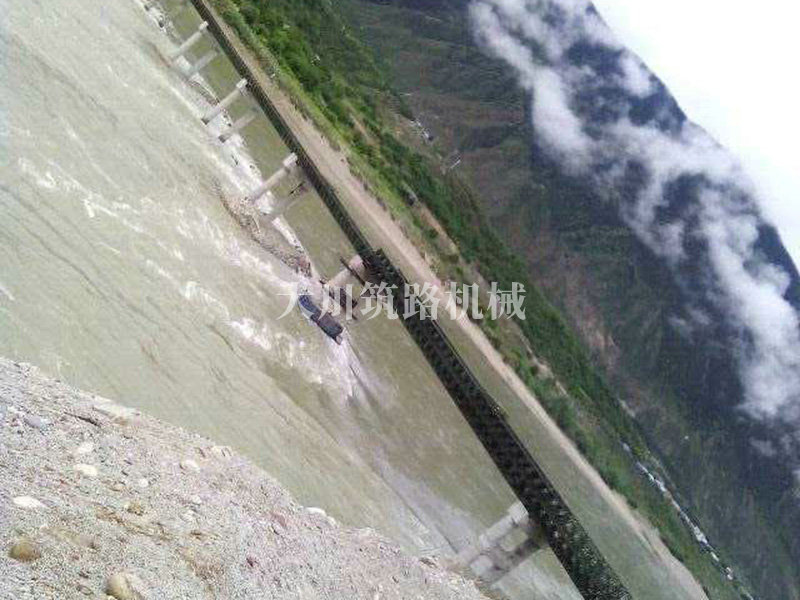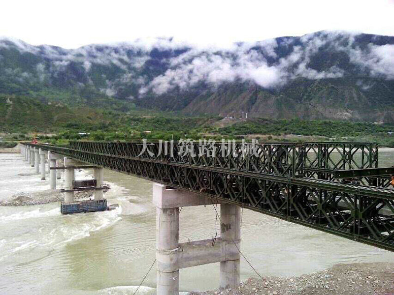 特點:本鋼橋拉薩到林芝鐵路控制性工程的重要組成部分,滿足荷載80T施工車輛通行。主河道水流急,橋墩高,經(jīng)多方多次論證和設計,最后采用了24+24+24+42+42+24M三排雙層單層混合型加強型雙橫梁下承式鋼橋??朔耸┕るy度大、氧氣較稀薄等因難因素,采用推出法安裝,于2015年6月通車。
