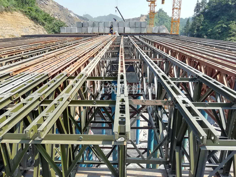 特點:現澆梁支架平臺的跨度大,高度高,施工現場場所地非常有限,在局促的場地中和其他施工隊伍的場地需交叉作業(yè)。安裝過程中因拼好的主梁沒有平整的場地放置,需要在拼好的貝雷片上面拼裝對接;有些梁也因場地原因致使吊機沒有好的停車位,不能整根梁吊裝,采用半根梁吊裝在空中對接方式完成安裝,施工難度較大。